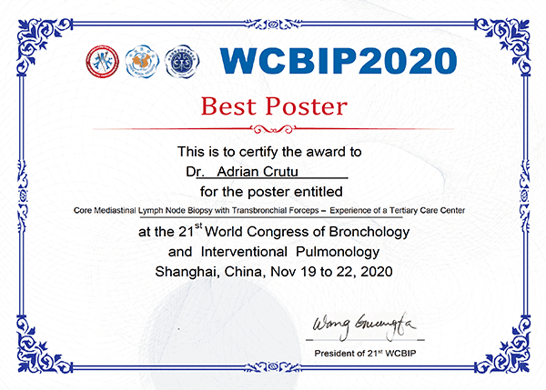 Décidément la WABIP honore le GELF de façon répétée. Après le Wabib-Dumon award du Dr Dutau, voici le prix du meilleur poster présenté au congrès WCBIP de Shangaî en Novembre 2020 décerné à notre collègue le Dr Adrian Crutu, membre très actif du GELF . Adrian Crutu travaille à l’hôpital Marie Lannelongue.