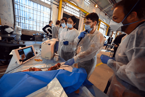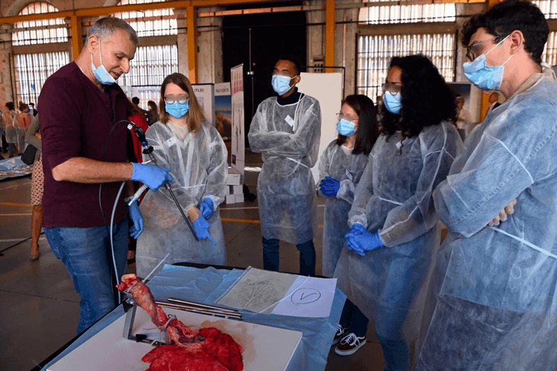 Le samedi 25 tout le monde était sur le pont pour les ateliers. 18 ateliers en tout pour explorer toutes les techniques de la pneumologie interventionnelle. Le matin, les gestes les plus basiques (extraction de corps étrangers, ponction à l’aiguille, échographie médiastinale et thoracique etc) et l’après midi des gestes plus sophistiqués dont cryobiopsies, dénervation, pose de valves ou thermoplastie. Les poumons de cochon ont donné le meilleur d’eux même et merci à nos 2 volontaires qui ont prêté leur thorax pour l’échographie. Par contre pour les ponctions échoguidées on a préféré le rôti fourré aux olives ! Vous verrez quelques photos pour apprécier l’ambiance de ces ateliers.