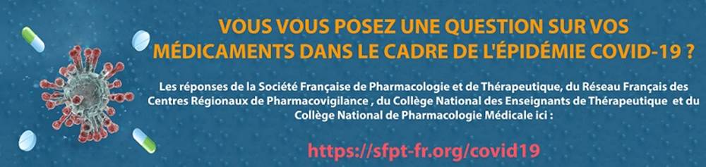 • La Société Française de Pharmacologie et de Thérapeutique, en partenariat avec le Réseau Français des Centres Régionaux de Pharmacovigilance , le Collège National des Enseignants de Thérapeutique et le Collège National de Pharmacologie Médicale met en place ces pages qui recensent des questions-réponses pour le grand public sur le médicament dans le cadre de prévention de l’épidémie COVID-19.