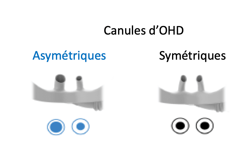 Une équipe néo-zélandaise a donc évalué l’hypothèse qu’une asymétrie d’occlusion narinaire avec des canules d’OHD (canules asymétriques) permettait d’augmenter le lavage de l’espace mort anatomique réduisant ainsi la ré-inhalation de CO2. Les auteurs ont donc testé, sur un modèle adulte de voies aériennes supérieures (VAS) ventilées avec du CO2, des canules d’OHD symétriques (CS) et asymétriques (CA) (figure) selon différents débits (20, 40 et 60L/mn), différentes fréquences respiratoires (FR : 15 à 45 c/mn) et différents profils ventilatoires simulés (BPCO notamment). La clairance du CO2 était analysée par modélisation optique par spectroscopie infrarouge (500Hz).