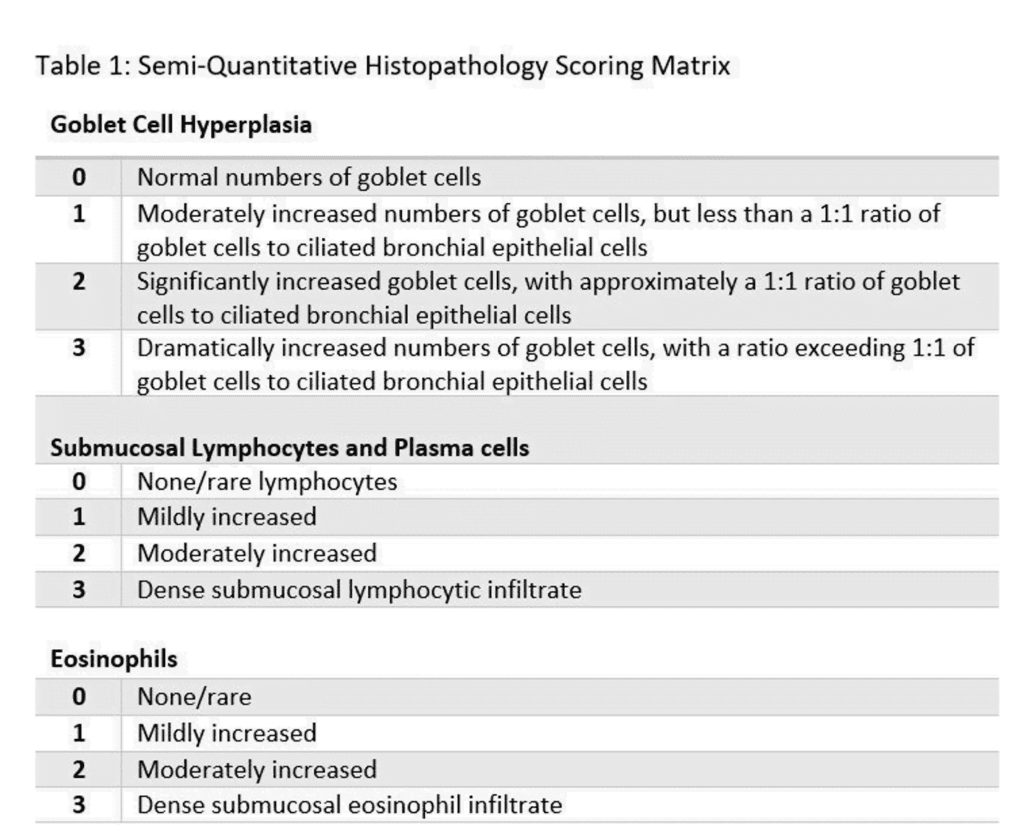Trente patients avec BC ont eu de façon séquentielle une rhéoplastie bronchique bilatérale. Des cryobiopsies bronchiques ont été réalisées au niveau du tronc intermédiaire et au niveau du lobe inférieur gauche avant traitement et 3 mois après la seconde procédure. Les prélèvements ont été analysés par un anatomo-pathologiste indépendant avec évaluation semi-quantitative de la GCH et de la présence dans la sous-muqueuse d’éosinophiles et de lymphocytes/plasmocytes en utilisant une échelle en 4-points (Table 1). A l’état de base, les biopsies étaient évaluables dans 58 poumons/60. Le GCH score moyen avant traitement était de 1.47±0.90 avec 85% (49/58) des biopsies montrant un score GCH élevé, défini comme un score > 1. Les scores moyens d’éosinophiles et de lymphocytes à l’état de base étaient de 0.52±0.74 et 0.74±0.76, respectivement. Les éosinophiles étaient présents avec un score élevé chez 18 patients. Une tendance vers une corrélation positive entre le score GCH à l’état de base et le COPD Assessment Test (CAT) (r=0.327, p=0.08) et le St. George’s Respiratory Questionnaire (SGRQ) (r=0.32, p=0.102) a été trouvée. Dans 54 poumons avec biopsies évaluables avant et après traitement, la baisse par rapport aux valeurs de base des scores GCH et éosinophiles étaient de -0.57±0.94 (p<0.001) et de -0.29±0.90 (p=0.02), respectivement. Aucune modification significative du score de lymphocytes n’a été observée. Chez presque tous les patients (16/ 17) avec score élevé d’éosinophiles à l’état de base évaluables après traitement, le score biopsique s’est amélioré ≥1 point après la procédure et 11/17 patients n’avaient plus d’éosinophiles présents dans leurs biopsies post-traitement. Les patients avec une amélioration du score éosinophile avaient une probabilité de réponse symptomatique > 4 points au CAT, score 1.75 fois plus élevé (95% CI 0.48 to 6.35). En conclusion, l’ablation non thermique de l’épithélium des voies aériennes basses au moyen d’un champ électrique pulsé permet une réduction statistiquement significative de l’hyperplasie des cellules caliciformes et du score éosinophile, sous-tendant le mécanisme d’action de la rhéoplastie. La diminution de ces scores anatomo-pathologiques après rhéoplastie semble associée à une amélioration de la qualité de vie des patients avec BC. Ces données sont encore préliminaires mais il semble s’agir d’une voie prometteuse pour améliorer la prise en charge des patients avec BC.